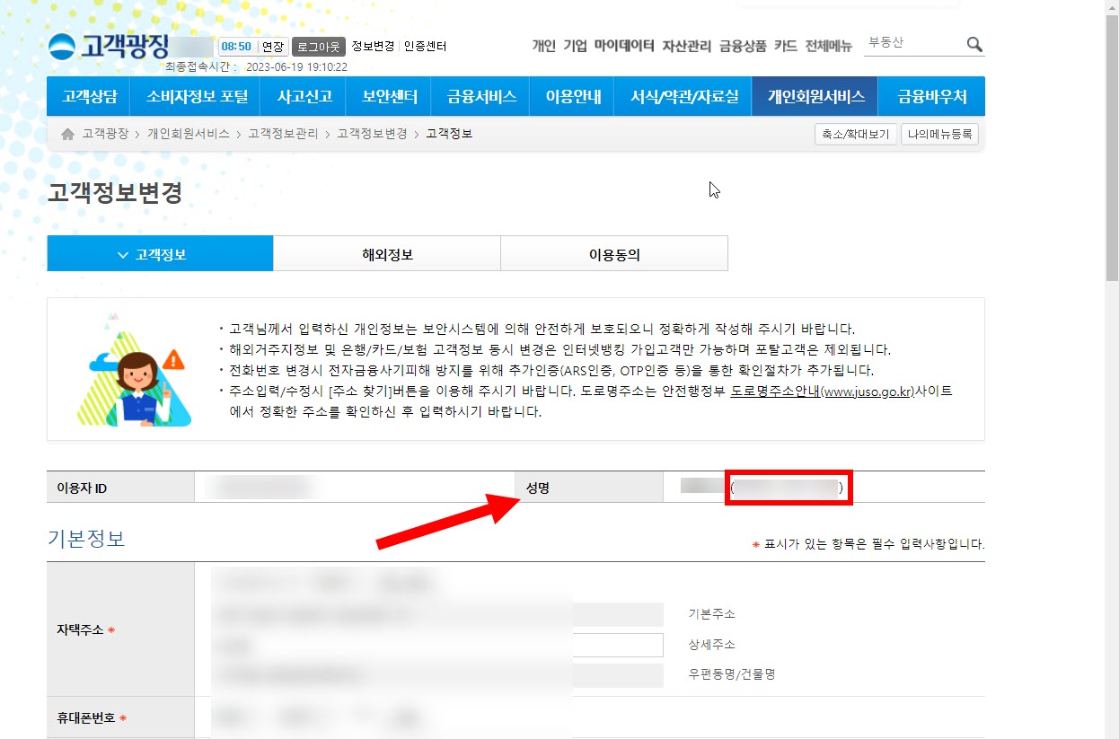 2)고객정보변경에서 성명의 영문이름을 확인할수있습니다.