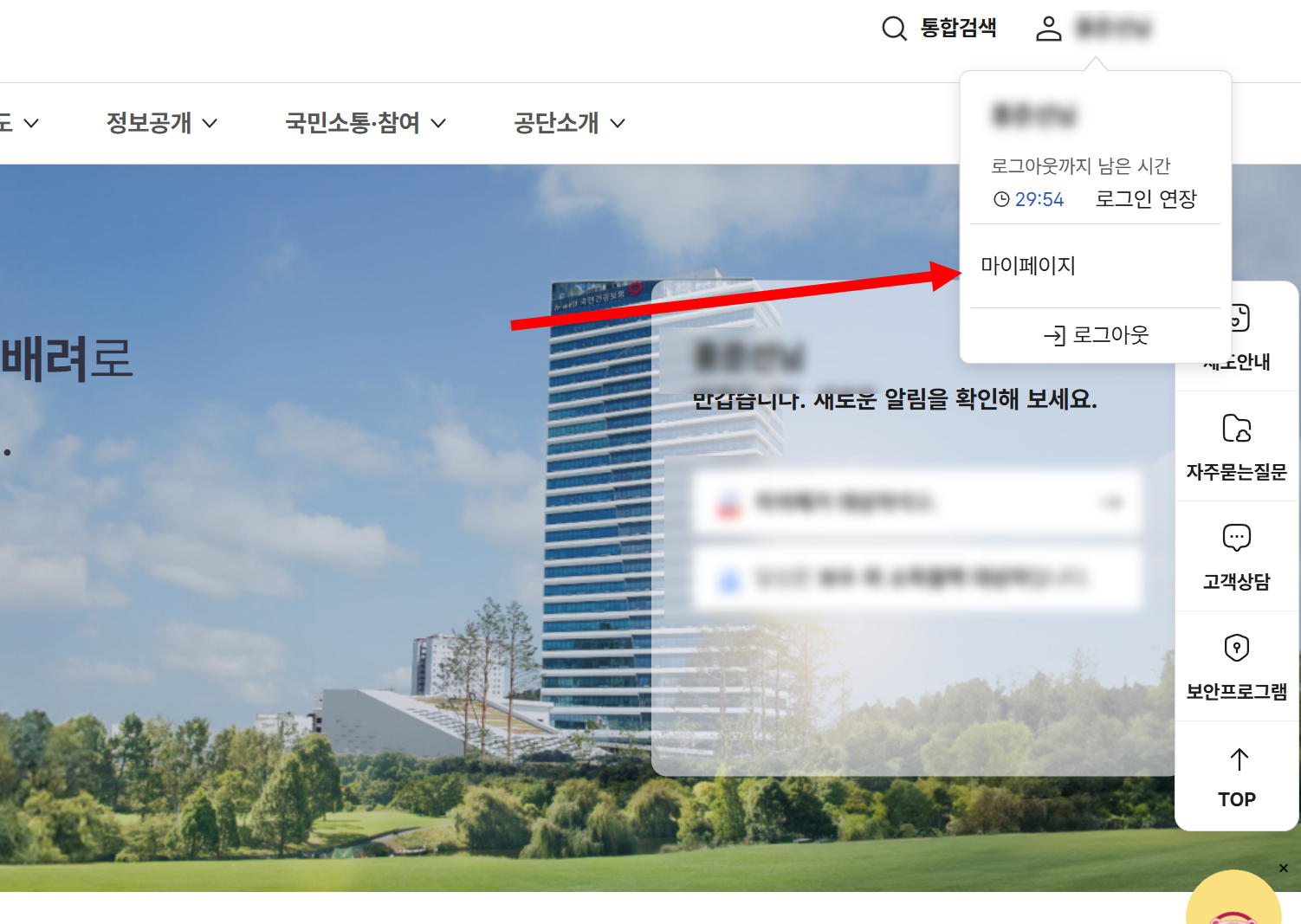1)국민건강보험공단 홈페이지에서 사용자 로그인하고 마이페이지로 이동합니다.