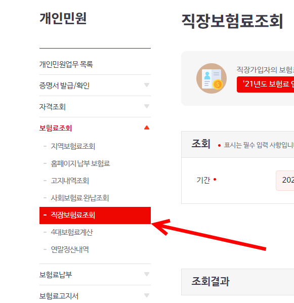 3)보험료조회의 직장보험료 조회를 선택한다.